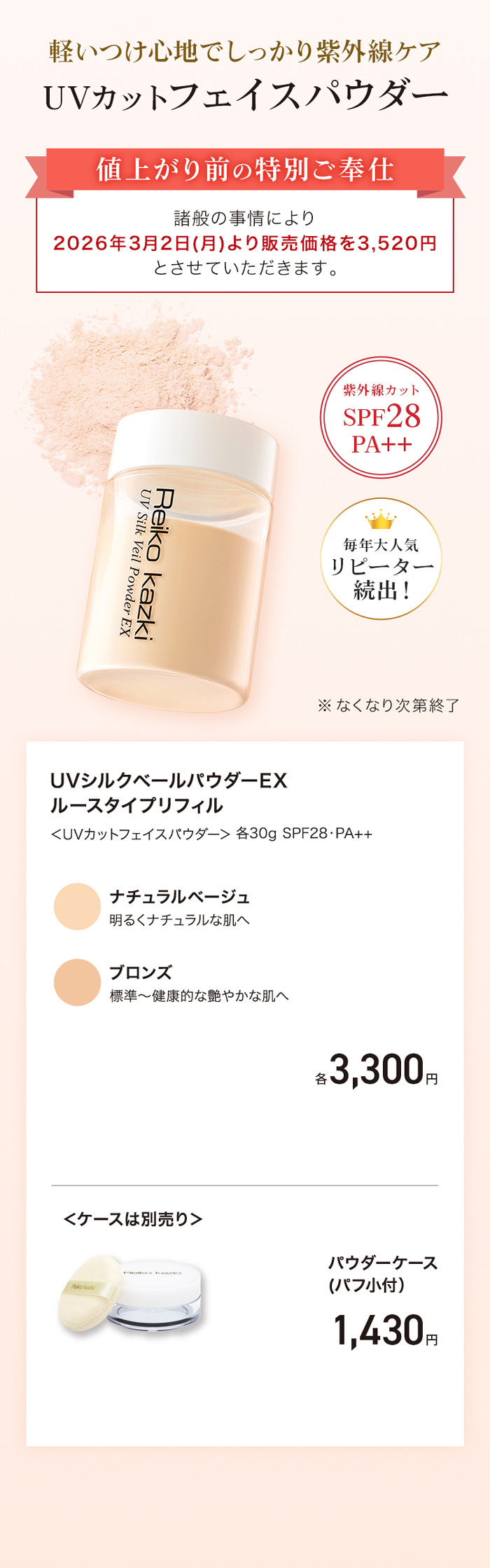 毎年大人気の『春夏限定』UVカットパウダーは、諸般の事情により2026年3月2日(月)より販売価格を3,520円とさせていただきます。
